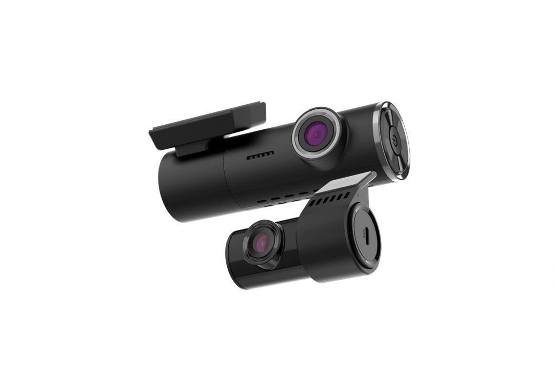 Автомобильный видеорегистратор с двумя камерами, выполненный в современном минималистичном стиле, с углом обзора 143°.